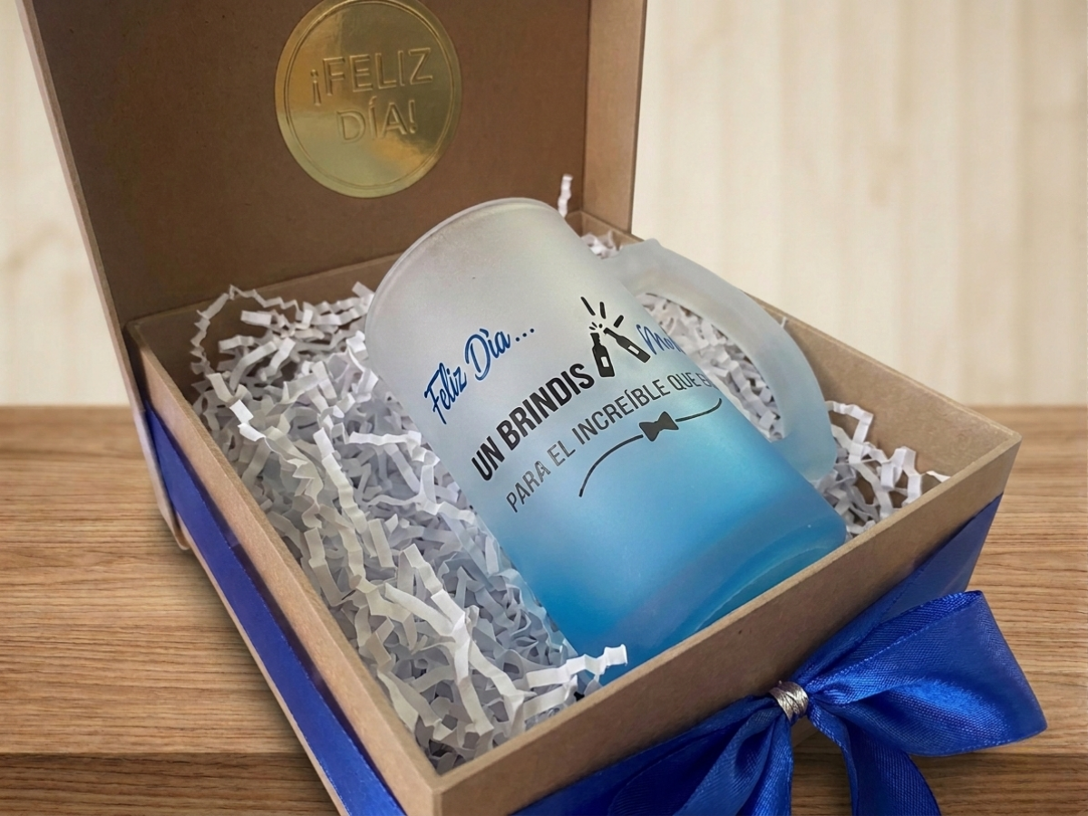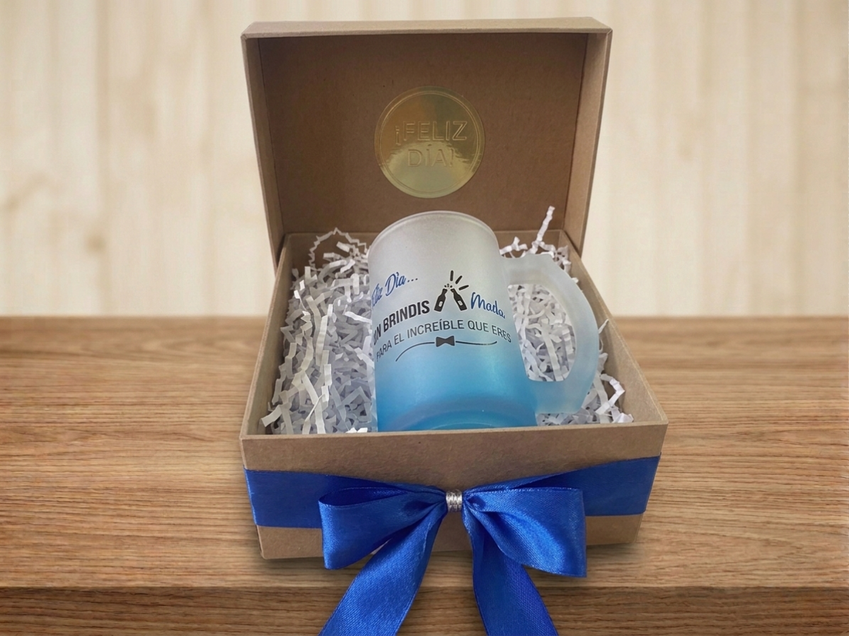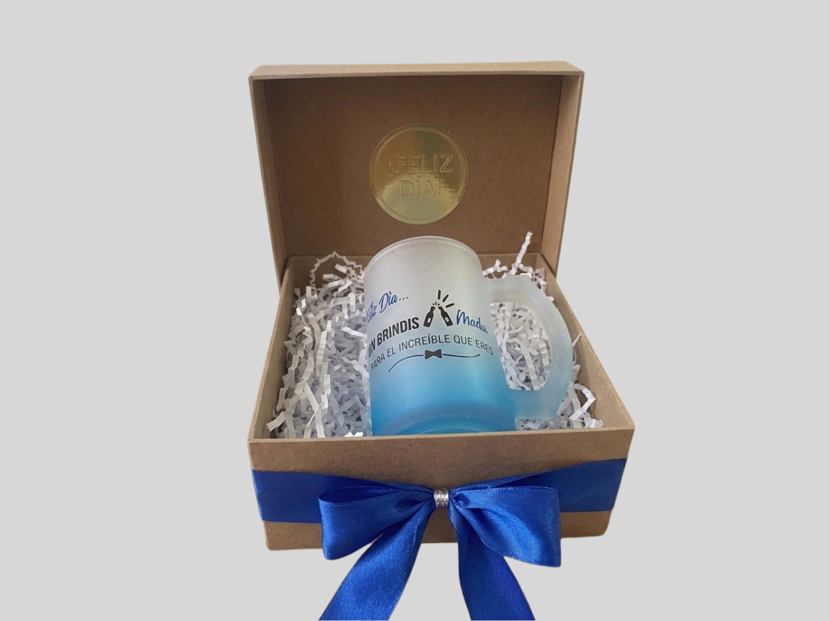 Mug Cervecero Opalizado 15x 8 cm de Vidrio templado con acabado esmerilado en degradado azul y un mensaje grabado que le recordará lo especial que es.